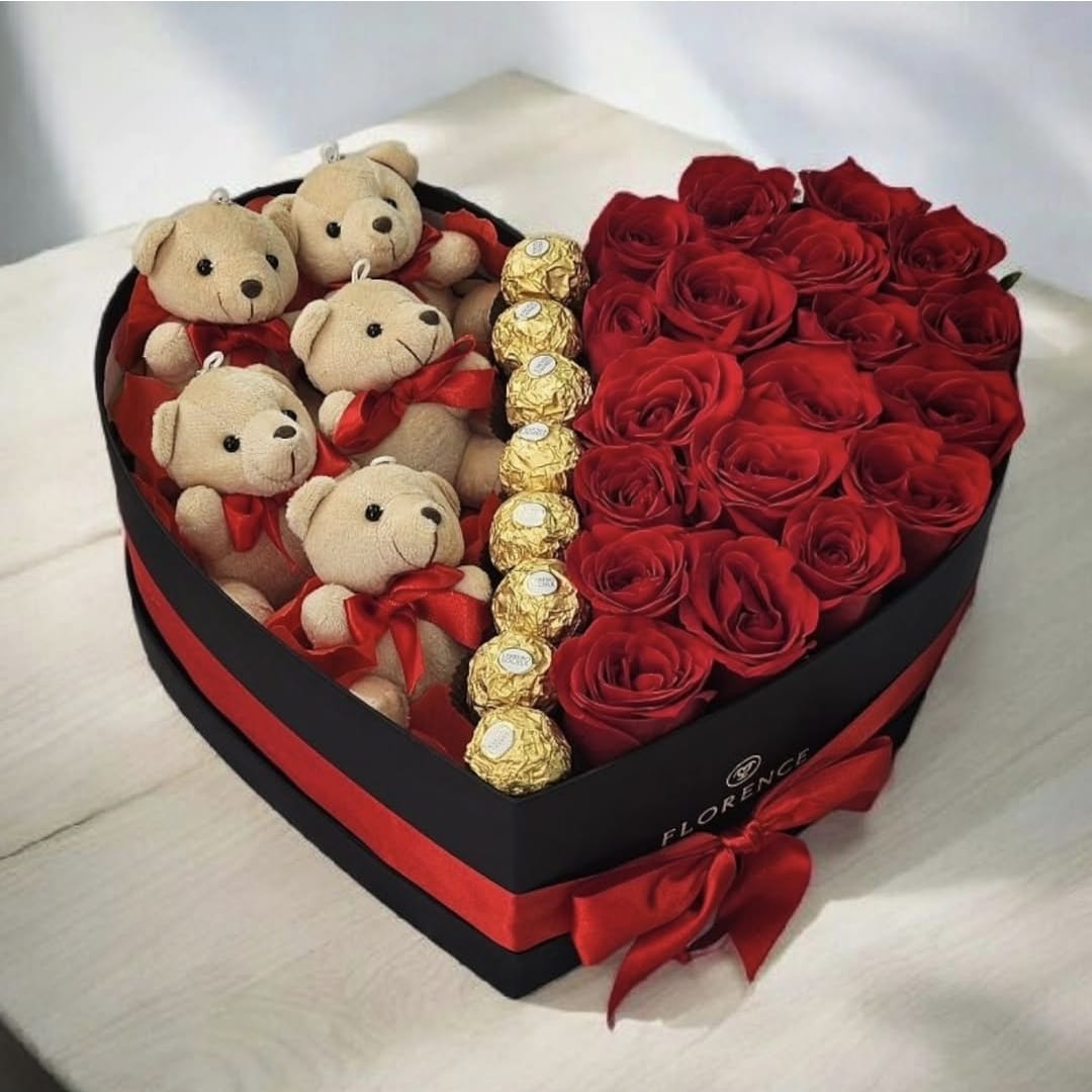 A Box Coração Mini Ursinhos, Rosas & Ferrero é um arranjo encantador que vai além das flores. Em um delicado box em formato de coração, reunimos rosas premium, mini ursinhos de pelúcia e os irresistíveis chocolates Ferrero Rocher. Um presente que emociona pelo carinho, sofisticação e originalidade.